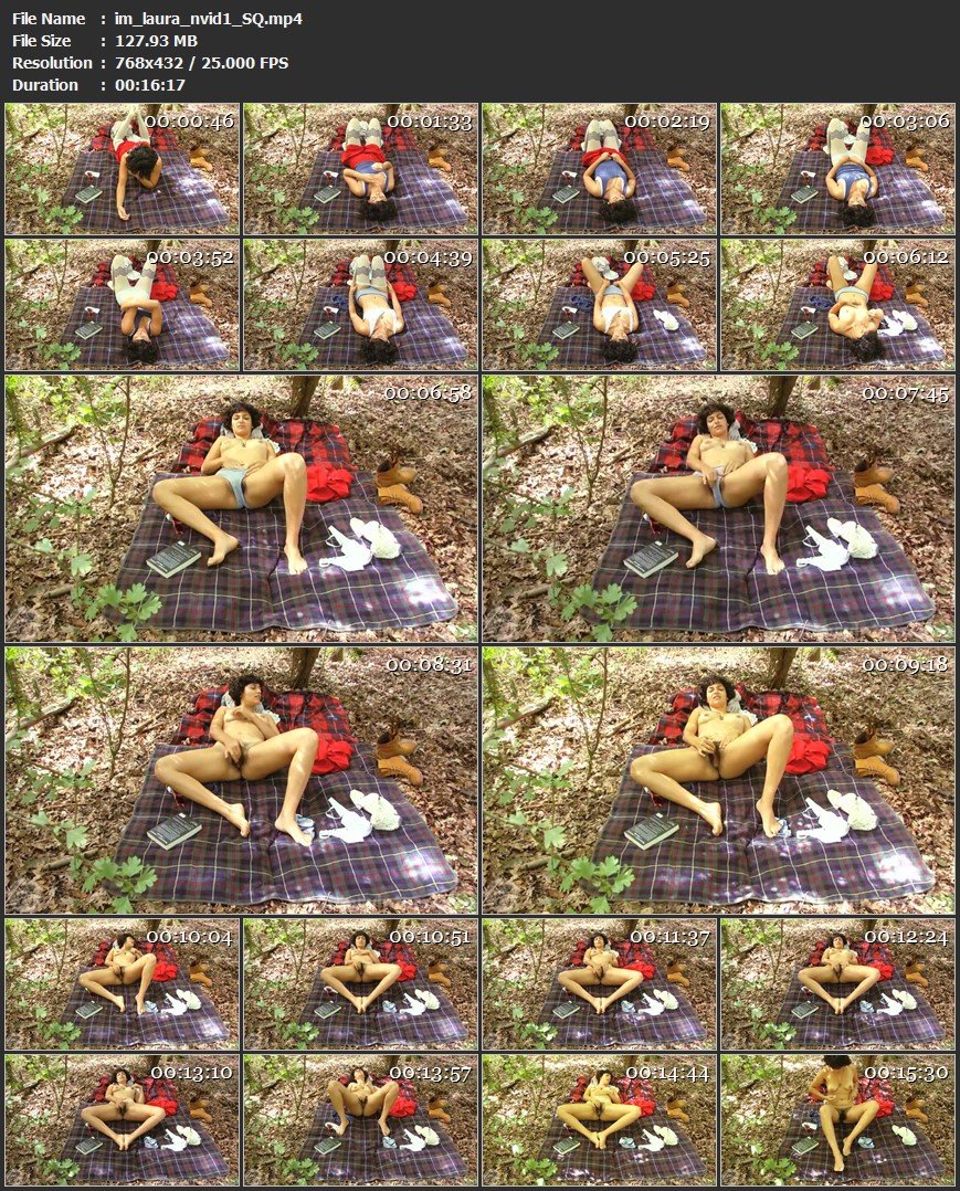 Lying on a blanket in the forest ground, Laura starts to caress her arms with her palms and places the book she is currently studying to the side. She turns around to lie on her back and uses the ring of her necklace to encircle her nipples.Her hands traveling around her entire body and reach her crotch. She removes her tights and shirt, strikes eyebrow peep and her armpit hair through. Alone outdoors, she massages her clit till she climaxes.