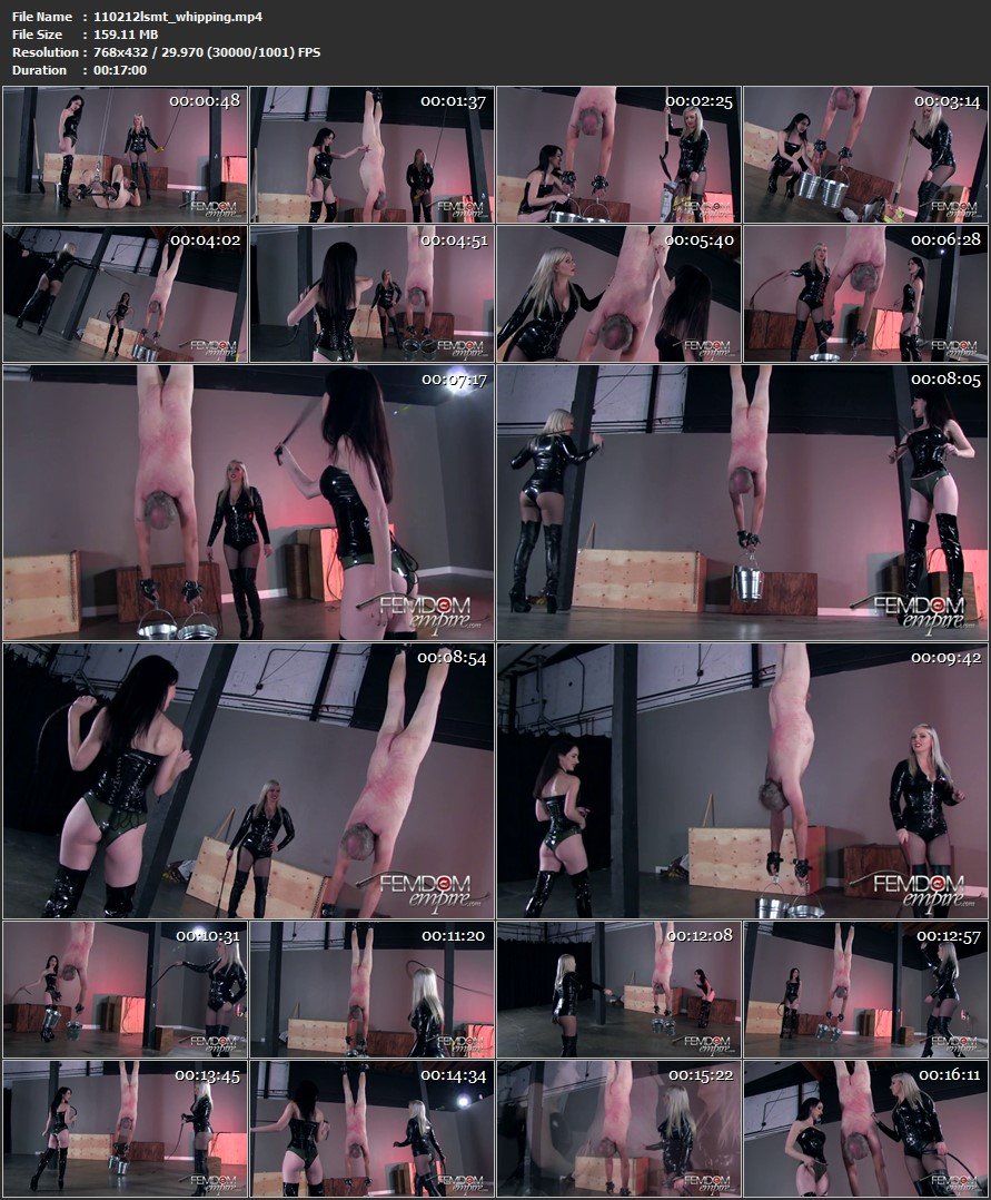 Submitting his own body for whipping is not enough, Lexi and Mina need much more to be suffered by him during his punishment. He is suspended by these cruel Mistresses upside down with ribbons of dirt hanging weighting down his hands. These sadists want him to endure absolute submission.They start off with 4 ft sign whips to wake up his flesh, plenty of excruciating wraps across his ribs. Lexi works her way up to twirling a 8 ft bull whip cracking cannon pops against his entire body. |