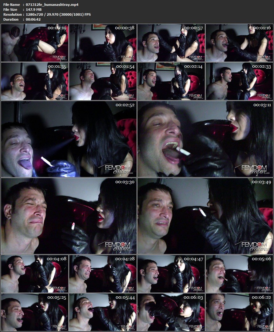 Goddess Miki likes a cigarette and abuses her slaves mouth while. She spits and ash in his mouthhe gags and chokes from the dreadful taste. She awakens puffy white clouds of smoke in his face with total disregard puts out the cigarette of his tongue. |