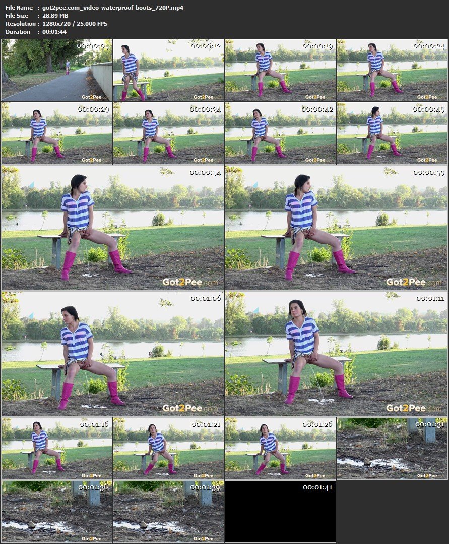 While walking outside in waterproof wellington boots, this dark haired cutie desperately needs to pee. She finds herself perched on a bench near a flowing river, letting her juices flow onto the ground, forming a puddle!
