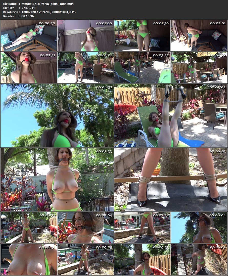 Leggy Terra Mizu is outside in her string bikini and bound. The little bikini top covers her tits. A enormous red ballgag is wedged into her mouth. Hobble and terra wiggles and handles to endure around the patio into her six inch stiletto high heels. She bends giving you a sweet butt shot teasing with her body. The next thing she knows she&intense;s been bound to a huge oak tree… her stunning long legs bound spread her large tits exposed and clover clamped. Poor helpless Terra&severe;s mouth is gagged with a spider ring gag along with the drool runs from her forced mouth on her big tits. She struggles in the hot sunshine moaning and whimpering expecting she will be free… |