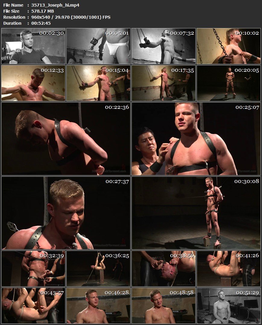 The Wall – Sexy pain slut, Joseph Rough believes he has what is needed to surpass the challenge which 30 Minutes of Torment comes in store. He begins his first job together with feet and his hands chained to the wall since Van gets his penis rock hard for a flogging. The boy adopts the leather whip before his nipples are dragged his chest beaten down with Van’s fists and tight and good. – The Pit – With his hands Joseph’s given the cat-o-nine tails until alloy clover clamps pinch against his sweaty skin. – The Gimp Station – Joseph has his feet and hands bound together as Van awakens up his ass . The gimp is then let loose, and his cock ready to fuck Joseph from both ends. With the gimp pounding away, Joseph completes his three challenges by blowing his load.