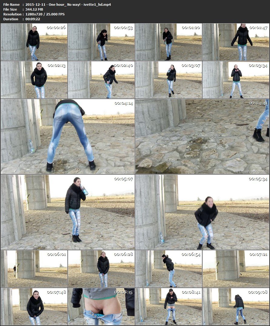 Yes, the original plan was to torture Ivette for one hour. Well it became obvious very soon that theres no way she could hold it for so long. So our cameraman at least did some short tests – Ivette had to squat down, watch running water or run around the columns. After just ten minutes she gave up and admitted she couldnt hold it anymore. We told her to pull down her pants slightly and piss a strong stream right into them (so that we could watch her pussy). What a nice stream into her completely soaked jeans!