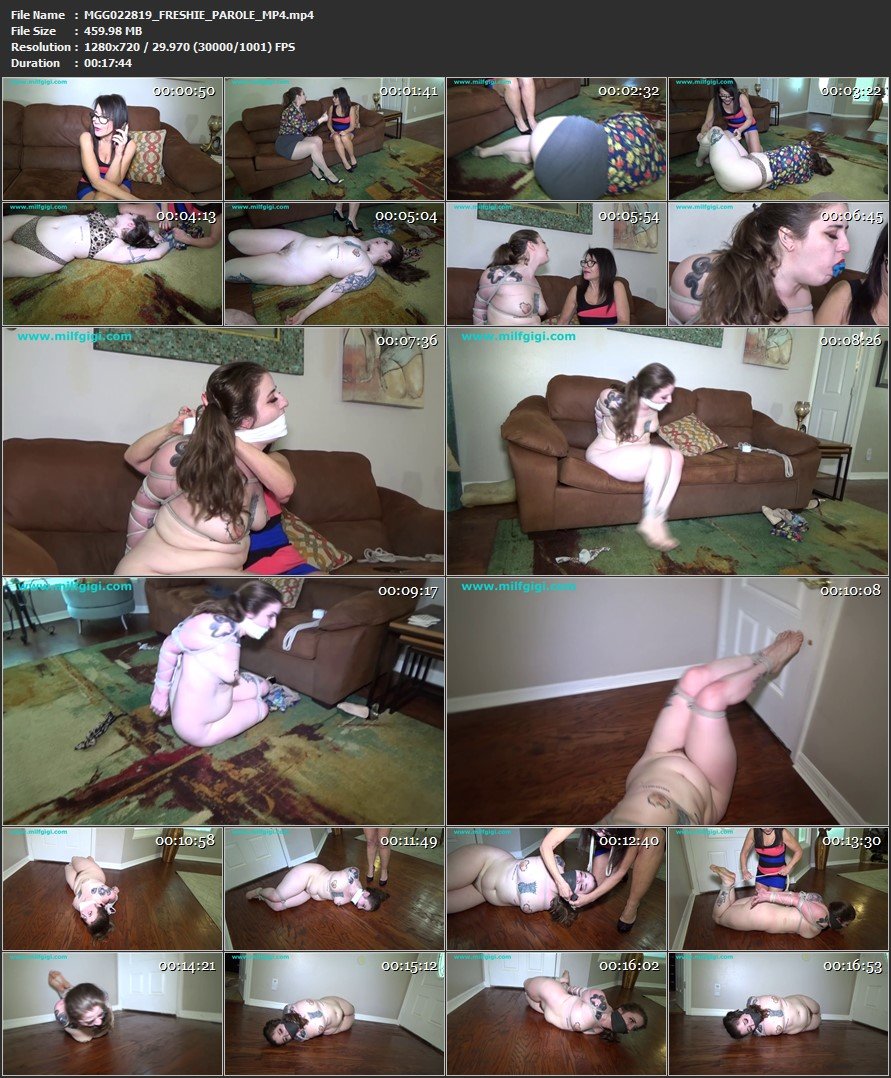 I was just released from prison a few months ago and am now living with my new friend in his big house. The video begins with me talking to him on the phone about jewel last jewel heist. When I hear how much money we made, I tell him that we need to go find another heist. Just then the door bell rings. And when I look up I find Miss Freshie Juice, my parole officer, at the door. Freshie has been looking for me because I failed to report in for my last mandatory appointment. Freshie informs me that I was not supposed to move out of the county and especially not to have any contact with known felons without first getting permission from my parole officer. She then informs me that she is going to have to take me in. But just as Freshie starts to call her office, I grabs her from behind in a choke hold and overpower her. Once Freshie is subdued I remove all her clothing leaving her naked. I grab some rope and toss it next to Freshie´s nude curvy body. Freshie comes to and realizes she´s very tightly bound. She looks at big with her big blue eys and desperately tries to talk me into letting her go. I laugh as I peel down my satin panties and shut her up by stuffing her mouth with them. I tape the gag into her mouth with layers of thick electrical tape. Once satisfied that Freshie isn´t going anywhere I leave her bound on the couch to go make some plans for her disappearance. Freshie panics struggling furiously to get herself onto the floor and frantically struggle to reach the front door inch by inch looking over her shoulder the entire time. Finally Freshie gets to the door and lifts her bound legs trying desperately to unlock the latch with her bare feet. She sobs as she makes no progress and starts to screaming for help. Once she hears my footsteps returning. Freshie makes one last effort to scream through her gag pushing on the panty gag stuffing. I walk in to find Freshie trying to escape. I scold Freshie grabbing Freshies hair and fondling her body to the disgust of my captive and tell her that she knows too much and we cannot let her leave. I add one final piece of rope yanking the thick girl into a super tight hogtie. I leave her helplessly struggling in a panic wondering her fate …