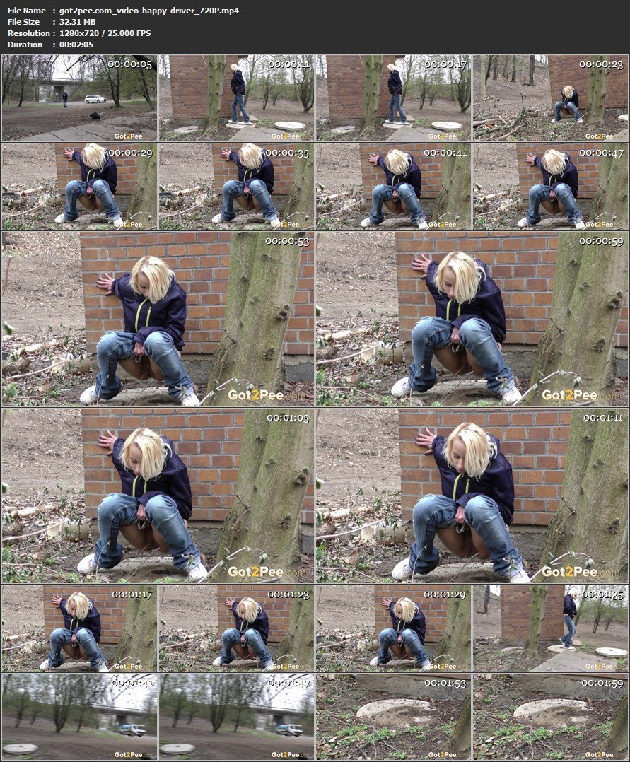 Outside near a road, a blonde girl is bursting to piss so decides to piss on a concrete slab near an outhouse. Her long stream of piss trickles onto the floor as traffic drive past, making some very happy drivers indeed as they get a glimpse of this public pissing action!