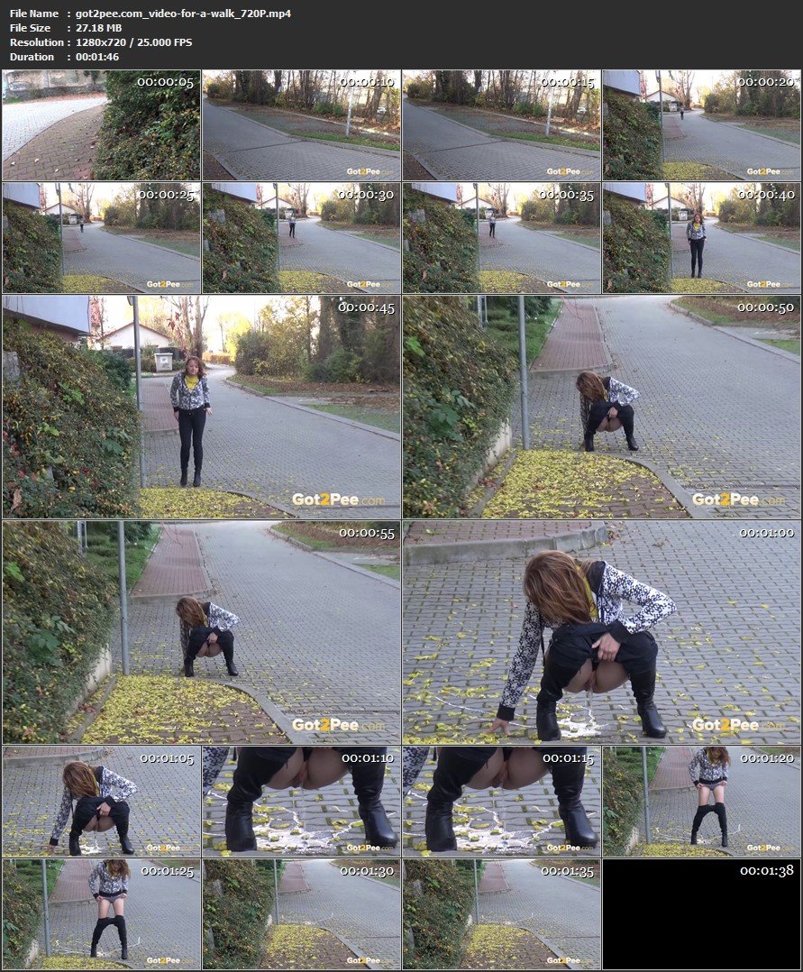 A European girl is in the suburbs walking by some houses when she realises she really needs a piss. She squats on the corner of a road, and pulls down her trousers to pee onto the concrete making a nice wet piss puddle.