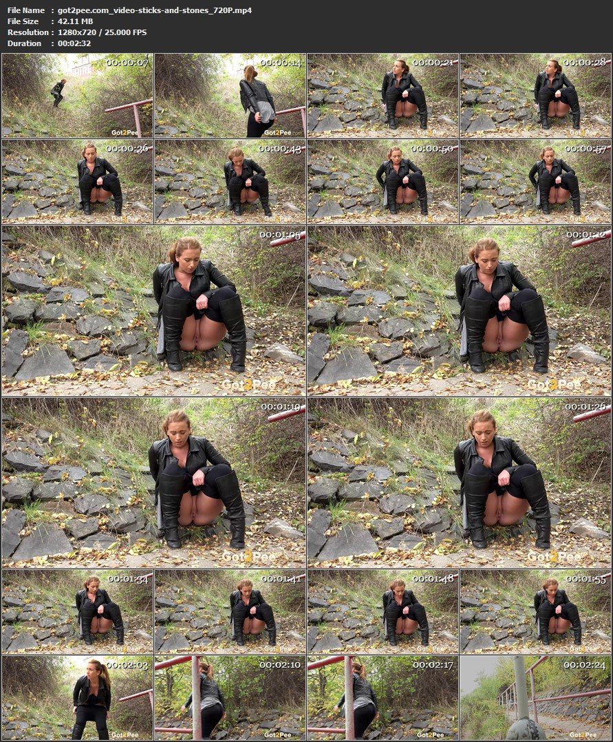 While outside in the woodland, a desperate to pee girl in knee high boots brings down her leggings and laps on the rocks since she sprinkles her pee over the floor. She is so nervous about being captured it takes a little while for her to begin! |