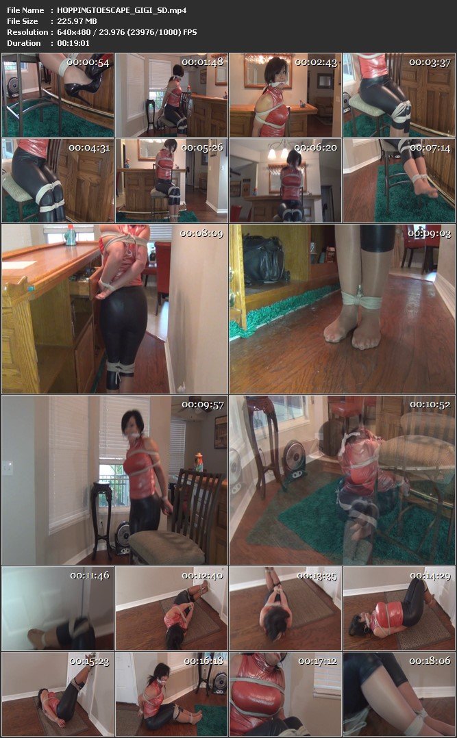 this was a 20 minute customs which I had lots of fun with. After the short intro, the clip starts with me tied at the ankles, above the knees, over and under my tits and arms behind my back. I am wearing shiny sexy black capri leggings, a slinky silky red sleeveless turtleneck top and red soled black six inch pumps – super high heels. I am tied sitting on a bar stool wiggling my feet and moaning through the white cleave gag. I manage to wiggle a shoe leaving it dangling off my foot. Then kick it off and do the same to the remaining shoe. I am now in my stocking feet and I just know I can make it off this high bar stool. I stumble off and hop around looking for a way to escape. I hop around and around the bar, across the living room floor and finally end up at the front door!!! I can´t seem to get myself to the ground so I hop back to the bar and use a chair for leverage to lower myself without falling. Since I am so tightly bound this is very very difficult. aaaahhh at last I am on my ass and I wiggle and squirm over to the front door. I walk my feet up to the door knob and begin to try to open the door with my feet!!!! This is no easy task and I start to get oh so frustrated. I grunt and groan and struggle over and over and my feet just slip all around the door knob without twisting it. I get soooooooooooooo discouraged and I wiggle and twist my body around like crazy until I feel the ropes on my wrists begin to loosen. Oh yayyyyyyyy!!! I know I got this!!! Escape is minutes away – I just know it. Finally my hand are free, but my arms remain securely bound to my body and despite my persistent movements, these ropes are there to stay. No wiggle room there at all. I reach down to my bound ankles and swiftly get them untied. The door is so very close, but wait!!!! I can´t leave without my shoes. I fumble across the room to pick up my shoes and hop/run to the door to escape – freedom at last!!!! oh yeah and then I blow a kiss per the client´s request :)))